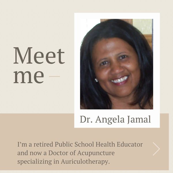 Dr. Angela of Jamal Health Works is a certified Clean Needle Technique (CNT) and skilled practitioner of Auriculotherapy (Ear acupressure) using ear seeds, originally trained in traditional Chinese medicine, and dedicated to promoting wellness through holistic approaches. With a background as a teacher, she combines knowledge and compassion to guide her clients towards better health.